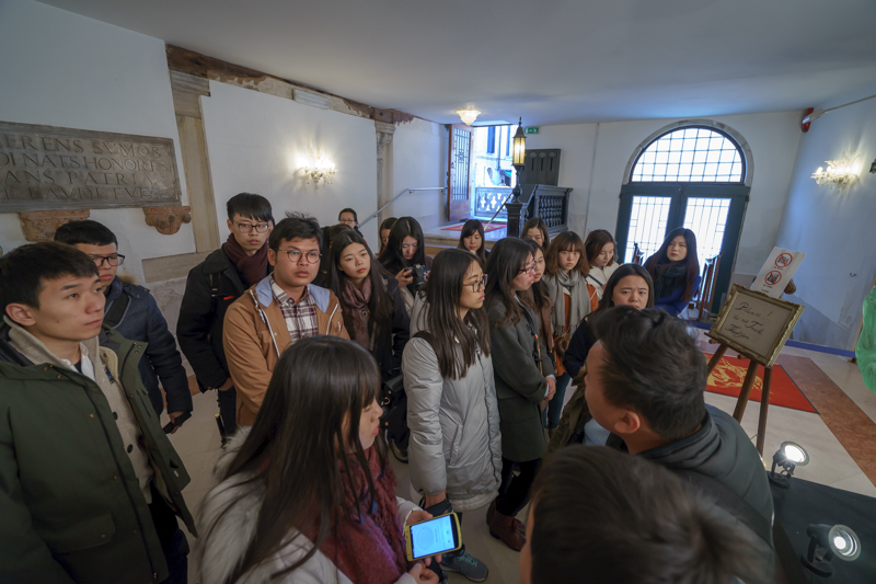 午时10点55分,访学团跟随向导安迪经叹息桥,过总督府,前往圣马可广场进行参观。站在圣马可广场的中央,安迪向访学团介绍道:“圣马可广场是威尼斯的中心广场,可分为大广场和小广场两个部分。圣马可小广场中伫立着早年间威尼斯总督所居的官邸、世界上最古老的图书馆,更有精致秀美的圣马可大教堂,因而被称为集政治、文化和宗教信仰为一身的‘三合一广场’。而圣马可大广场之上,则存留着威尼斯共和国的检察院以及拿破仑为自己所建造的行宫,更曾获得拿破仑的高度赞誉,称其为‘世界上最美的客厅’。”此外,安迪还表示:“位于圣马可大教堂旁边的圣马可钟楼是威尼斯岛上最高,也最年轻的建筑。它曾在1902年坍塌,后经修复,又重回了原来的面貌。虽然它不甚精致,但却是具有独特意义的建筑,伽利略曾在这座钟楼上,用自制的天文望远镜观察到了月球上的环形山,这是人类第一次看见月球上的山,也是人类历史上一个伟大的创举。”语毕,更示意访学团成员自行在威尼斯进行参观。