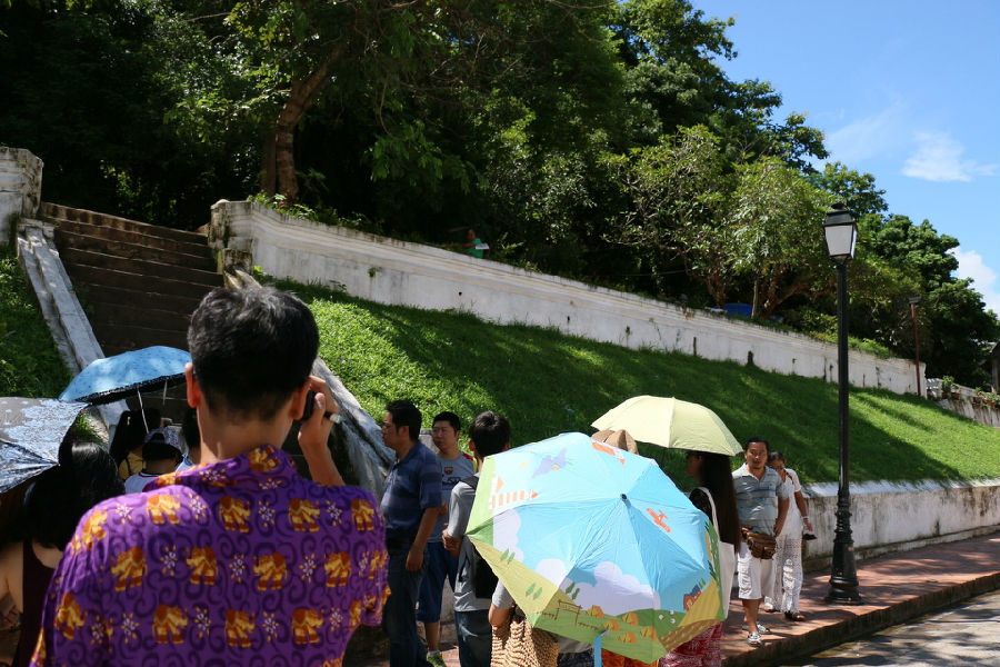 在前往朗布拉邦之前,我们去观看了历经四百五十多年首都变迁的万象寺院—塔銮寺,这里的寺院建筑整体风格是:“叠式寺顶”、平缓屋檐、圆梁柱支撑、地面平台较高,并饰以金色,给人的感觉庄严、神圣、耀眼。