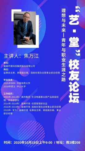 优秀校友、现任上市公司盈峰环境科技集团股份有限公司监事会主席、高级副总裁、固废处理及运营事业部总经理焦万江先生,莅临南望山校区教三楼208室,为地大学子开展以理想与未来为主题的讲座。果冻传媒