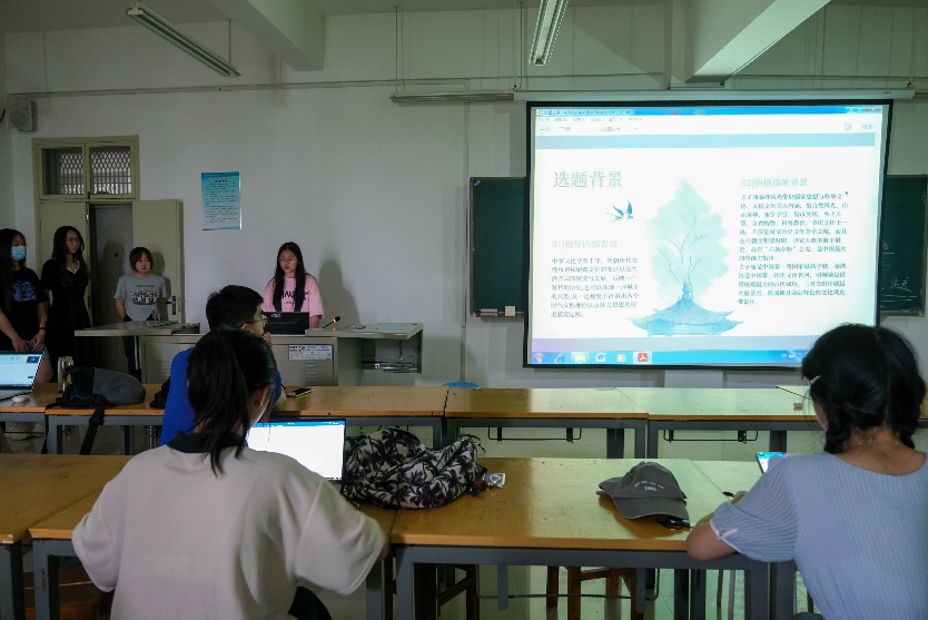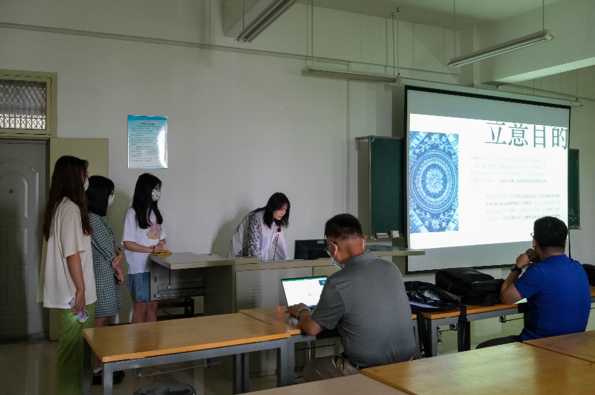 第二组汇报人高恬泽惠以白族扎染技艺相关背景切入,展开选题汇报。刘定耀老师叮嘱同学要事前联系好采访对象,注意时间安排,确保时间充裕,并购买人身意外保险再出发,喻继军老师肯定其方案,提醒学生注意防疫政策,实习以安全为第一位。