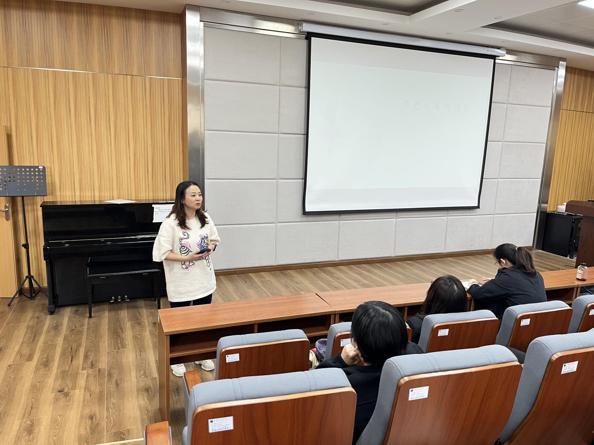 副院长袁玥副教授介绍了朱梅梵教授情况。朱梅梵,武汉理工大学本科生院素质教育中心,教授,博导,教育部学位中心评审专家、全国大学生文化素质教育学会理事、湖北省高校艺术教育研究会秘书长、全国美育研究会理事。出版多部文化艺术类专著、教材及音乐专辑;在《光明日报》理论版、《中国高等教育》、《中国高教研究》等重要期刊上发表论文30余篇;在中国MOOC平台录制上线《中国民族音乐》获国家精品课程;2011年和2016年在武汉音乐果冻传媒