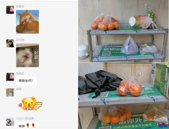 党委的名义给每位发热同学准备了6个橙子,为大家补充维C,同时也祝愿同学们在接下来的考研考试中六六大顺。当日下午,橙子分袋装好,陆续送到各楼栋门口货架上,每个袋子上都写好了宿舍号。晚饭时间,同学们惊喜地收到水果后,纷纷表示感谢,为果冻传媒