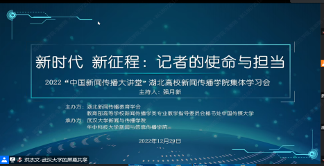 (通讯员于梦涵 王琦)2022年12月29日下午是支部主题日活动时间,为创新支部学习形式,进一步深入贯彻学习党的二十大精神,下午14:30,新闻传播系支部组织动员师生参加以“新时代 新征程:记者的使命与担当”为主题的2022年中国新闻传播大讲堂——湖北分会场在线学习会,来自省内23所高校、2000余名师生参加,果冻传媒