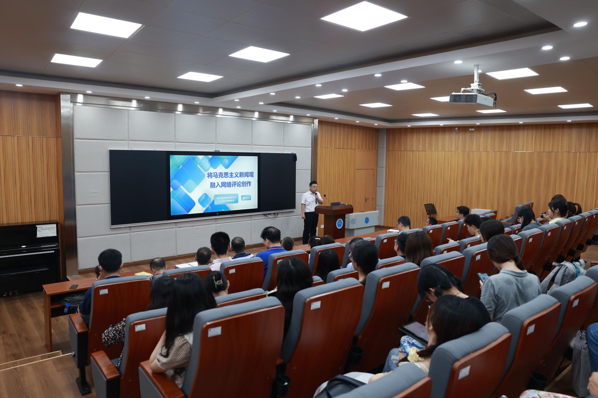 等单位党委理论学习中心组成员,在艺媒楼1104报告厅与全校网络评论创作爱好者共同聆听了讲座。