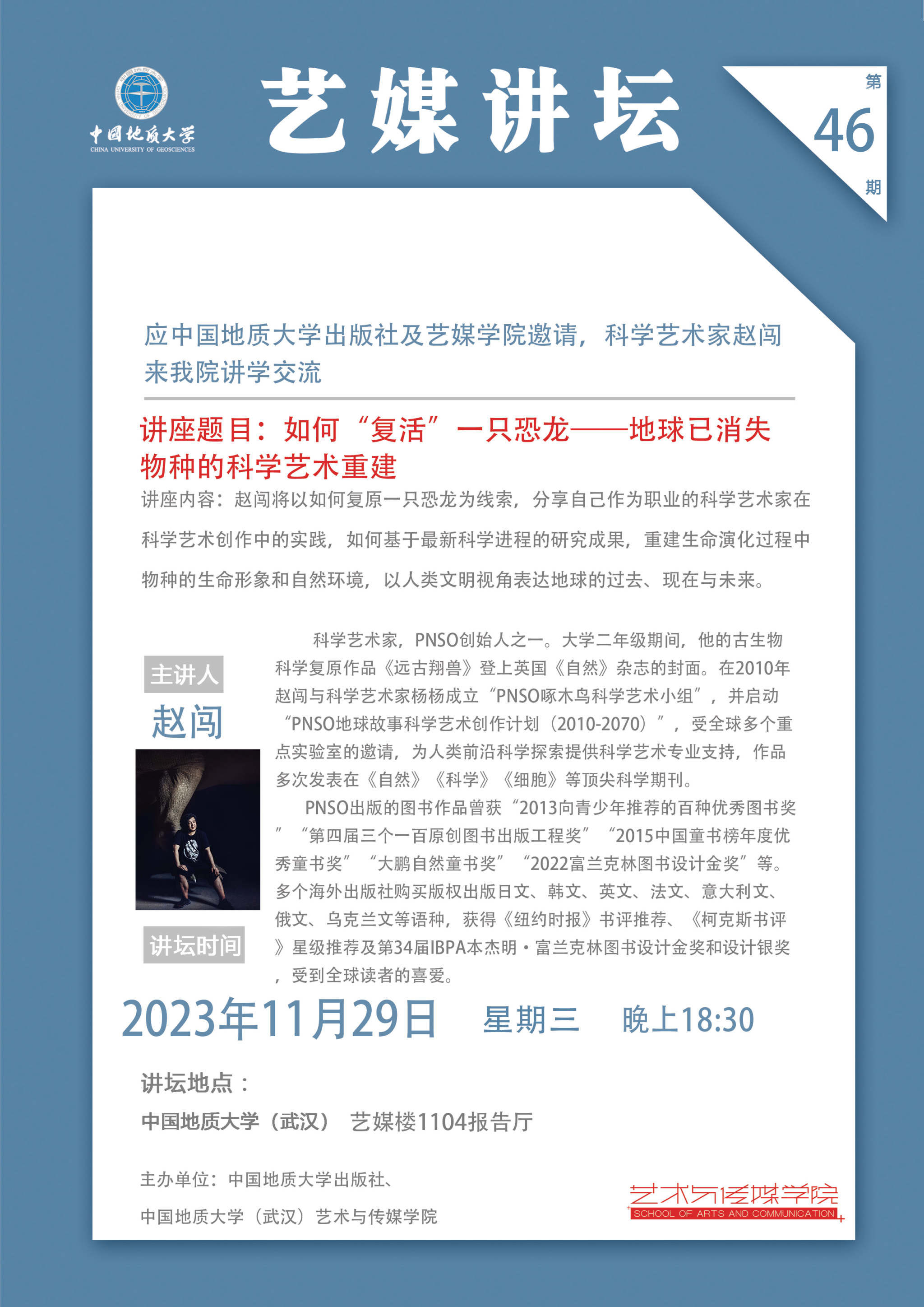 的邀请,2023年11月29日,科学艺术家赵闯先生做客“艺媒讲坛”讲学交流,在艺媒楼1104报告厅以《以如何“复活”一只恐龙——地球已消失物种的科学艺术重建》为题开展讲座。果冻传媒