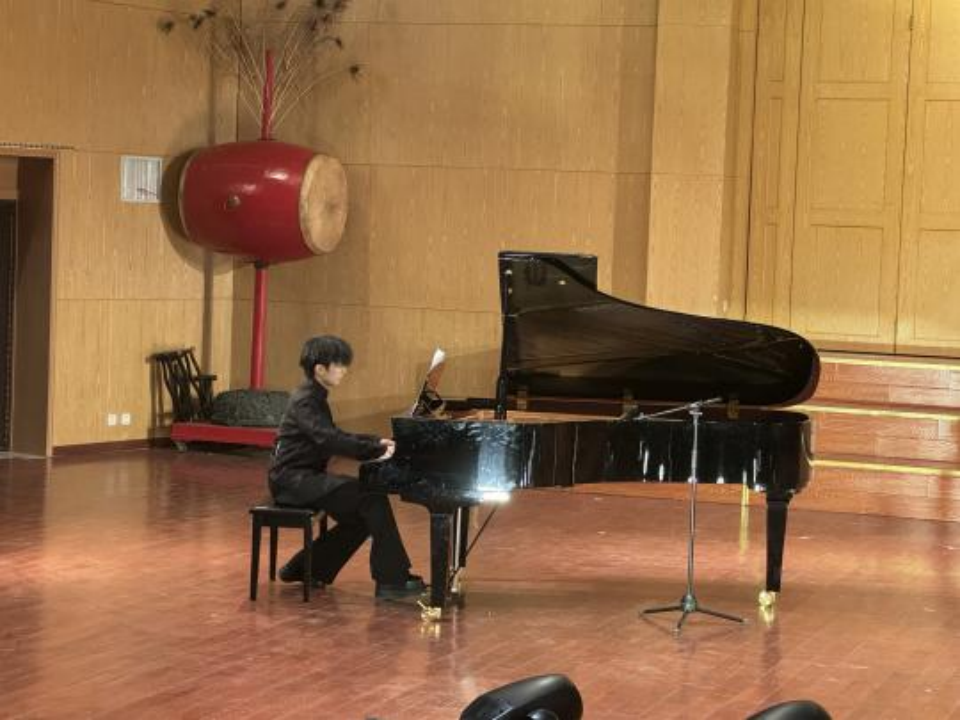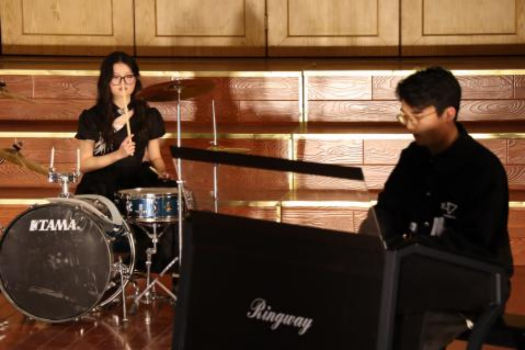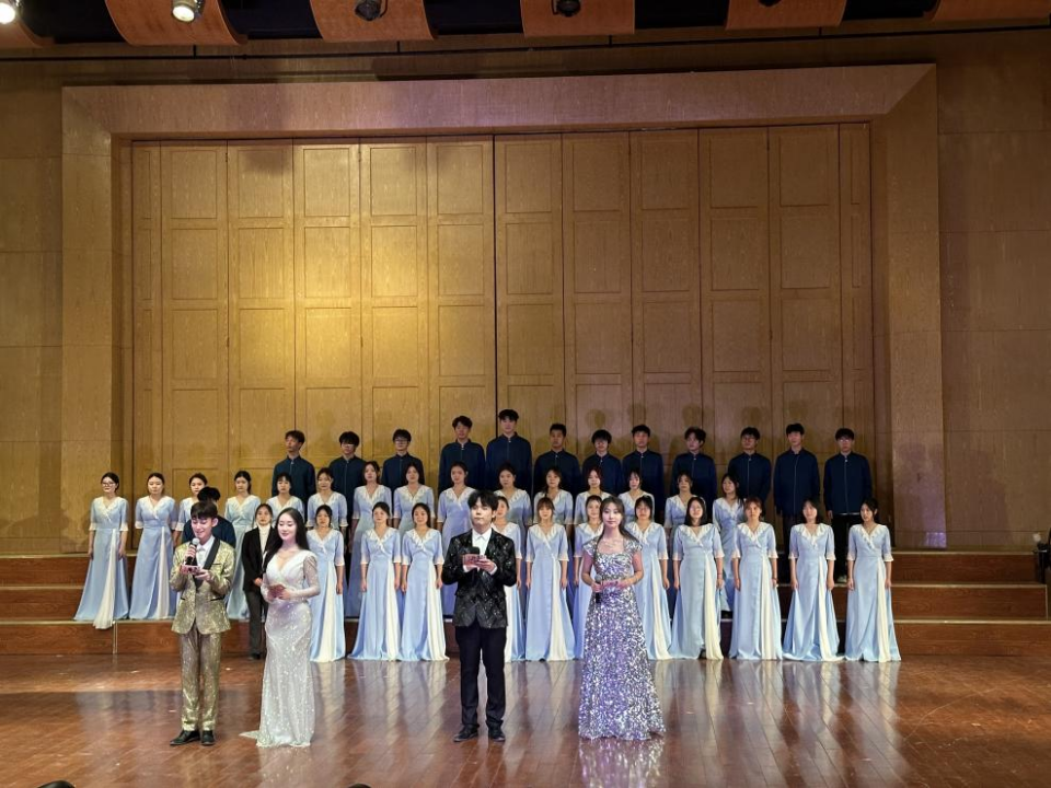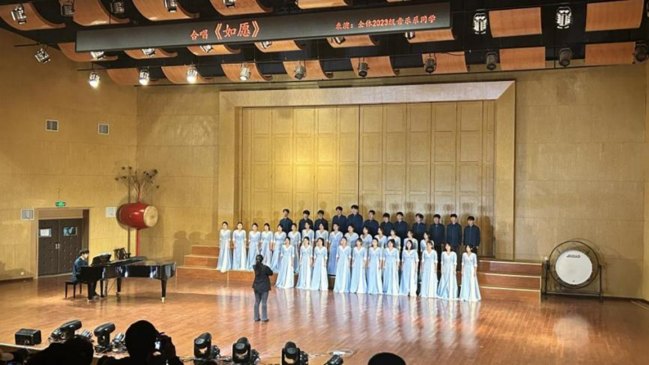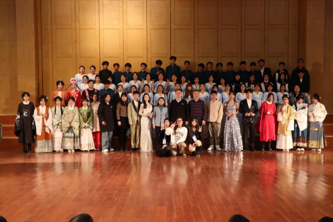 紧接着,2023级音乐学专业的同学们为大家带来一场“为我一挥手,如听万壑松”般的视听盛宴。他们以乐曲串烧和器乐重奏的形式,演绎了一首颇具创意的《疯狂星期四》。舞台上,同学们激情四溢,多样的乐器组合使得整个乐曲丰富多彩,或激情澎湃,或悠扬动人。他们用音乐传递着快乐和希望,现场气氛不断升温,观众们也为之沸腾。