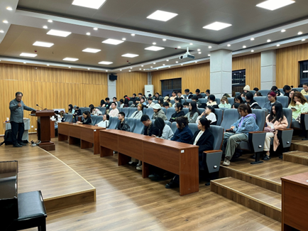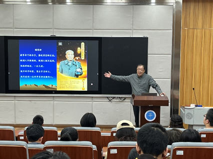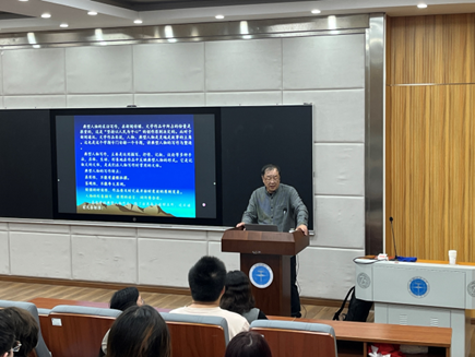 新闻传播系主任宁薇主持讲座。她介绍了陈国栋的简历。他是中国行业报协会名誉副会长,原中国自然资源报社社长。中国自然资源作家协会主席,中国作家协会第十届全委会委员,《大地文学》主编,果冻传媒
