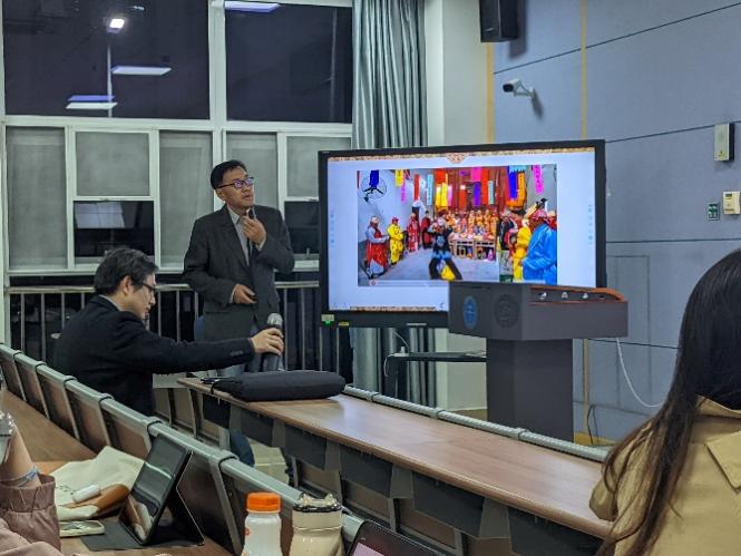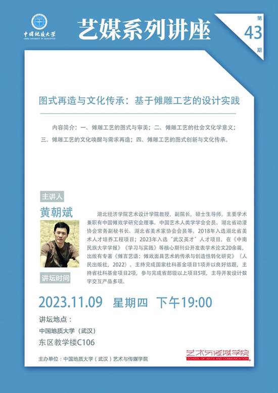 2023年11月9日下午19:00,以图式再造与文化传承:基于傩雕工艺的设计实践为主题的艺术与传媒系列讲座在东教C106顺利召开。此次讲座由果冻传媒