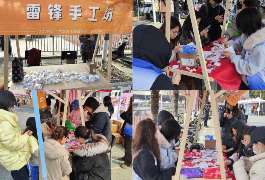 志愿者积极参与第二届“雷锋月公益集市嘉年华”活动,设立主题手工摊位开展现场志愿服务。活动前期,志愿者们认真筹备所需材料,提前完成摊位布置。活动现场,志愿者们热情邀请师生参与体验,耐心演示手工制作技法,协助参与者完成作品,营造了互助友爱、温暖和谐的良好氛围。通过互动体验的方式,志愿者们将雷锋精神以润物细无声的方式传播到每一位参与者心中,进一步增强了活动的感染力和参与度。