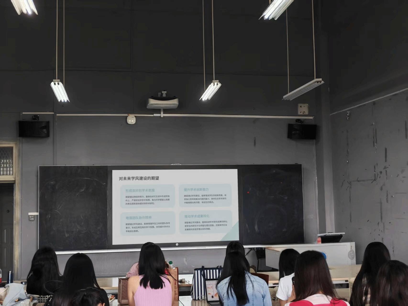 在讨论完各班级的学风建设计划后,各班班长和团支书带领同学集体学习《研究生教育工作手册》中研究生学术道德行为规范及管理办法、涉密研究生与涉密论文管理办法、学生纪律处分办法等方面进行学习。最后,会议邀请班级高年级的优秀学生进行学习方法、时间管理、竞赛实践等方面的经验分享。