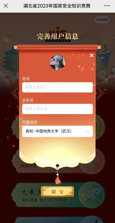 号召全体同学参加湖北省国安办举办的“国家安全,你我共同守护”全省国家安全知识大赛,以赛促学,进一步提高同学们的国家安全意识,筑牢国家安全防线。