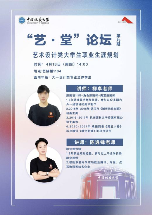 邀请原画设计师柳卓老师和职业规划师陈逸锋老师,在艺媒楼1104报告厅为2022级设计类专业学生开展了一场精彩的以“艺术设计类大学生职业生涯规划”为主题的讲座。