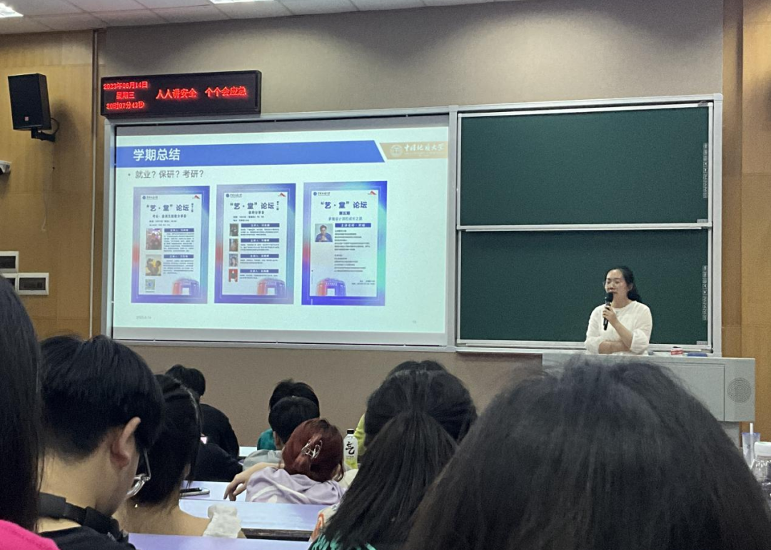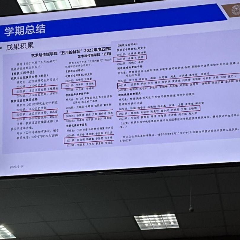 本次会议分为四个部分。首先,辅导员曾戈晖通报了各班级平均学分绩点情况,表扬鼓励了大部分班级,同时也勉励大家继续努力学习。对于马上到来的考试周,强调了考风考纪及学术规范,同时在大屏幕上展示了果冻传媒