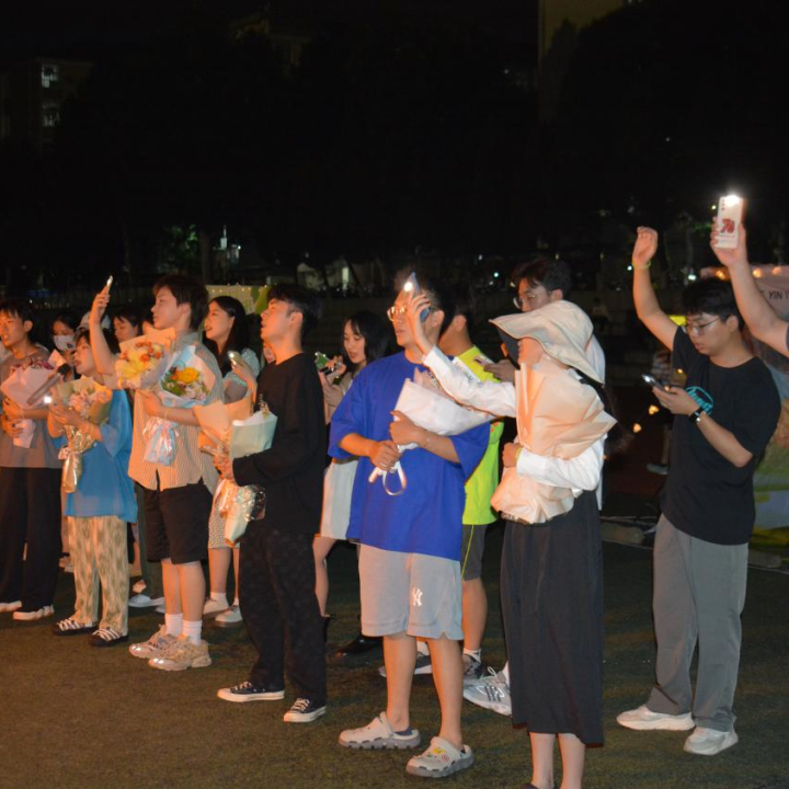 各位同学和老师依次上场,唱着离别不舍的歌,诉说着地大生活的美好。他们的歌声或温柔或坚定或悠扬,伴随现场观众的呼声与灯光一起,在操场萦绕,留下了许多难忘的回忆:一首《花海》勾起同学们的青春回忆,引发全体合唱;自作曲《懂爱》让同学们体会到父亲与女儿间爱的羁绊;学姐们的返场演出《太聪明》展现出地大毕业生们对学校的怀念与不舍......最后的师生大合唱把现场气氛推向高潮,展现地大师生的风貌,尽显青春靓丽的姿态。