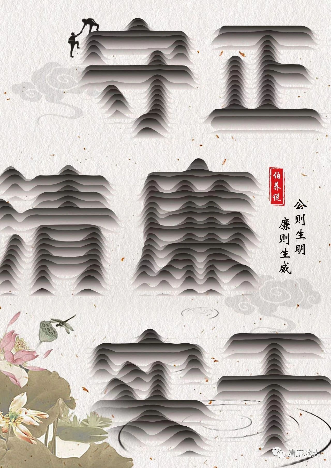 《水墨“话”清风》整体采用水墨风格的视觉呈现效果,清雅恬淡。高山,灵感源自《诗.小雅》——“高山仰止,景行行止”,意指品德高尚之人。作品中绵延的水墨高山元素组成醒目的“守正、清廉、实干“六个字,以二维高山元素堆叠形成三维视觉效果,与背景水墨莲花交相呼应,寓意弘扬清廉守正,担当实干之风。
