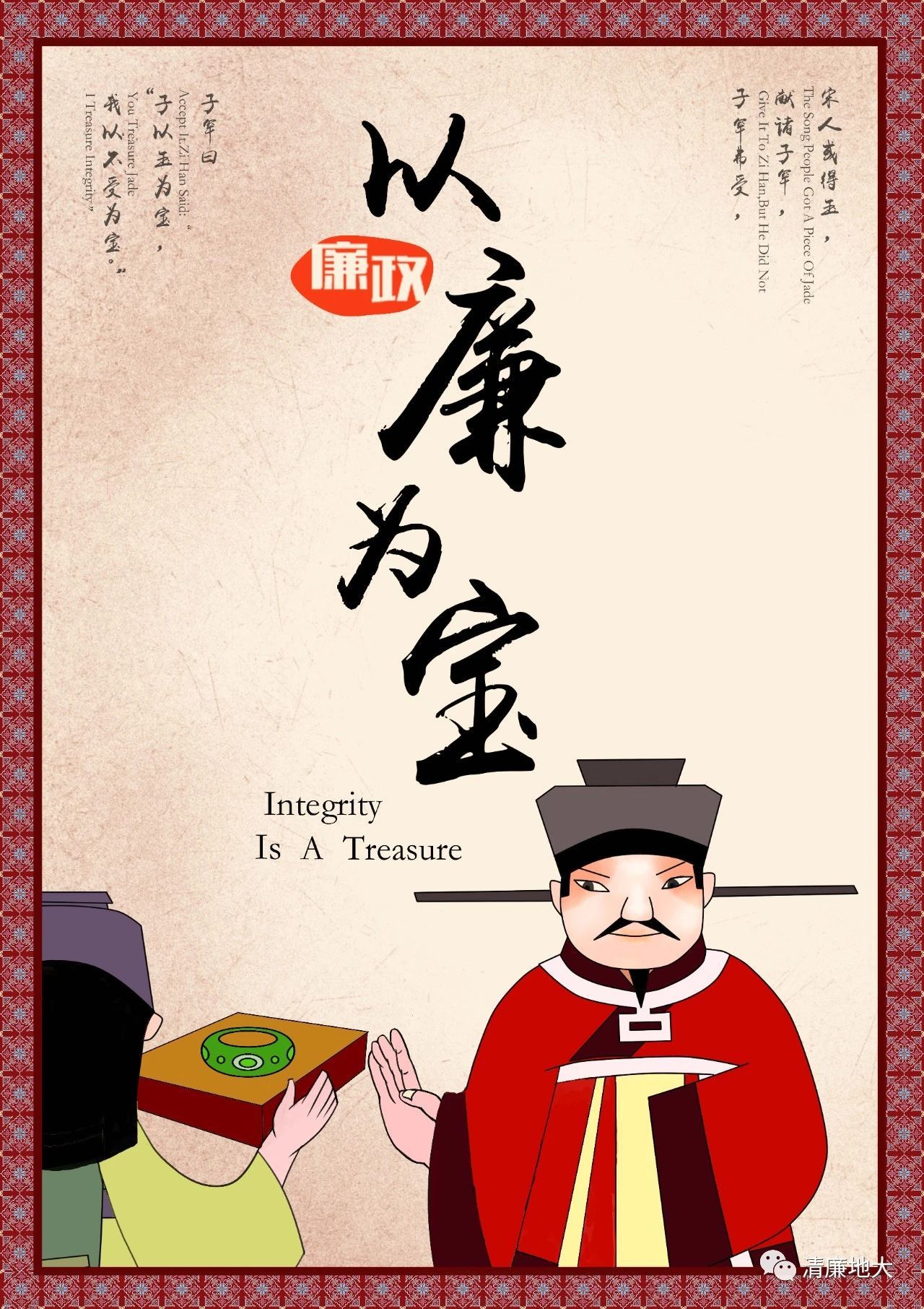 海报进行插画设计,风格简约素朴,传达居官应当清廉、为官应当正直、拒绝受贿的品质内涵。