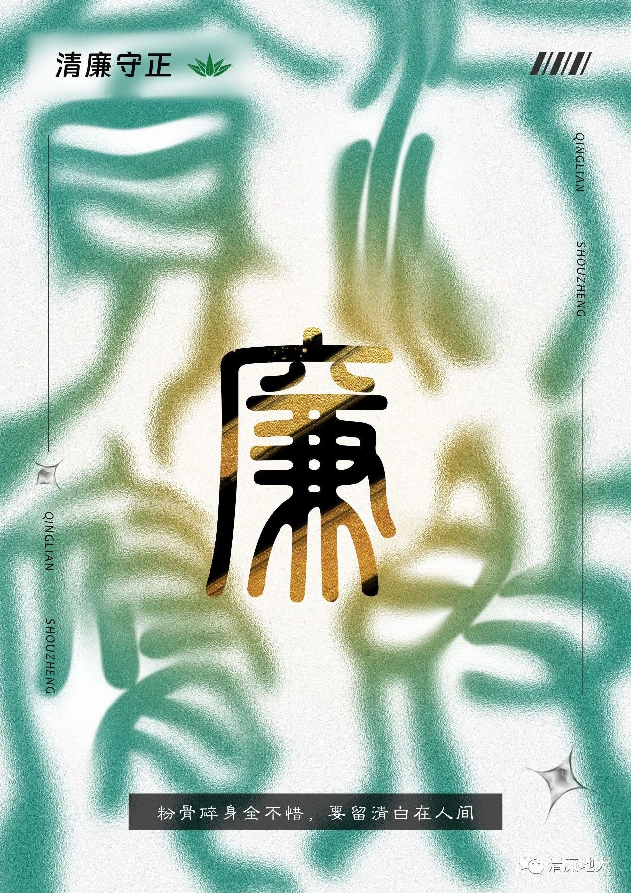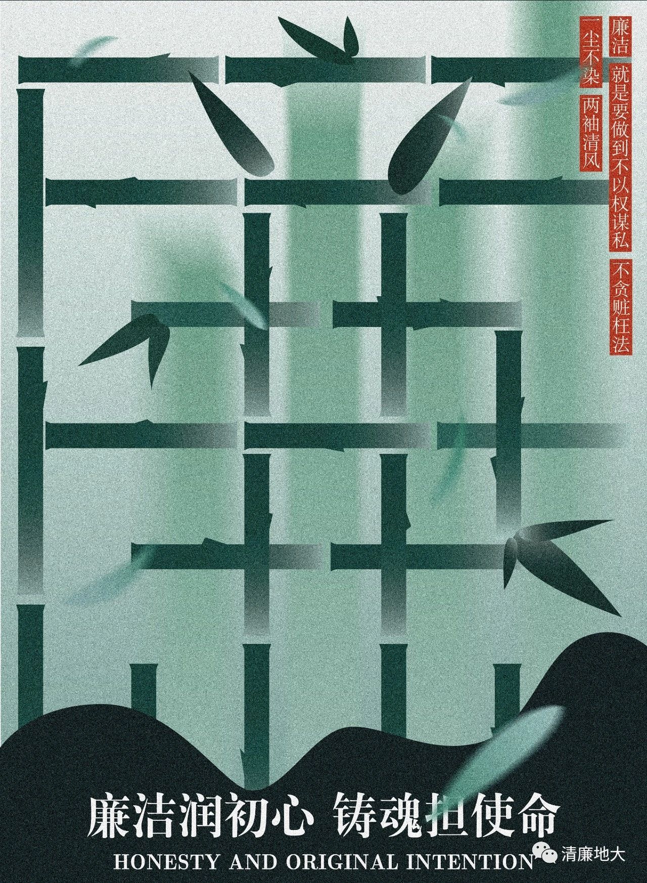本作品以“竹节”替换笔划,拼成廉字,以此将竹与廉进行了结合,紧扣主题。构图上采用居中对齐的方式,将主体“廉”字放大占满版面,突出主题,同时在版面下方将山石进行了扁平化的处理,一在体现竹自山石而生却依旧挺拔的坚韧之性,二在用山石作为果冻传媒