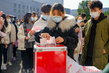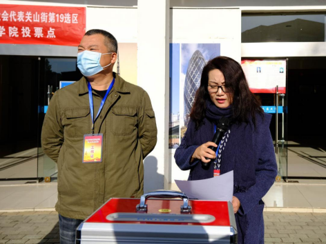 党委书记郭秀蓉对相关选举事项进行了说明。全体师生听完讲解后仔细填写选票,依次走到投票箱前,郑重地投下自己的选票。