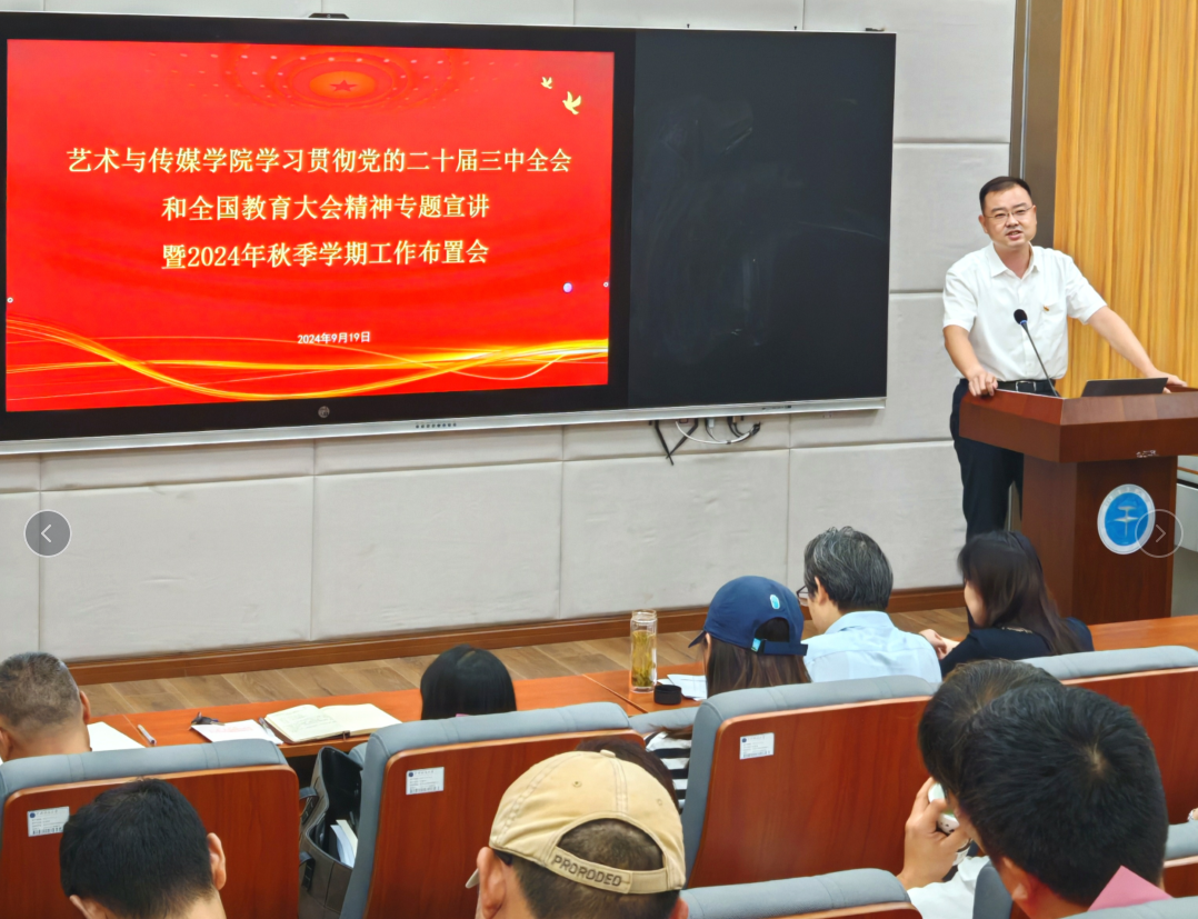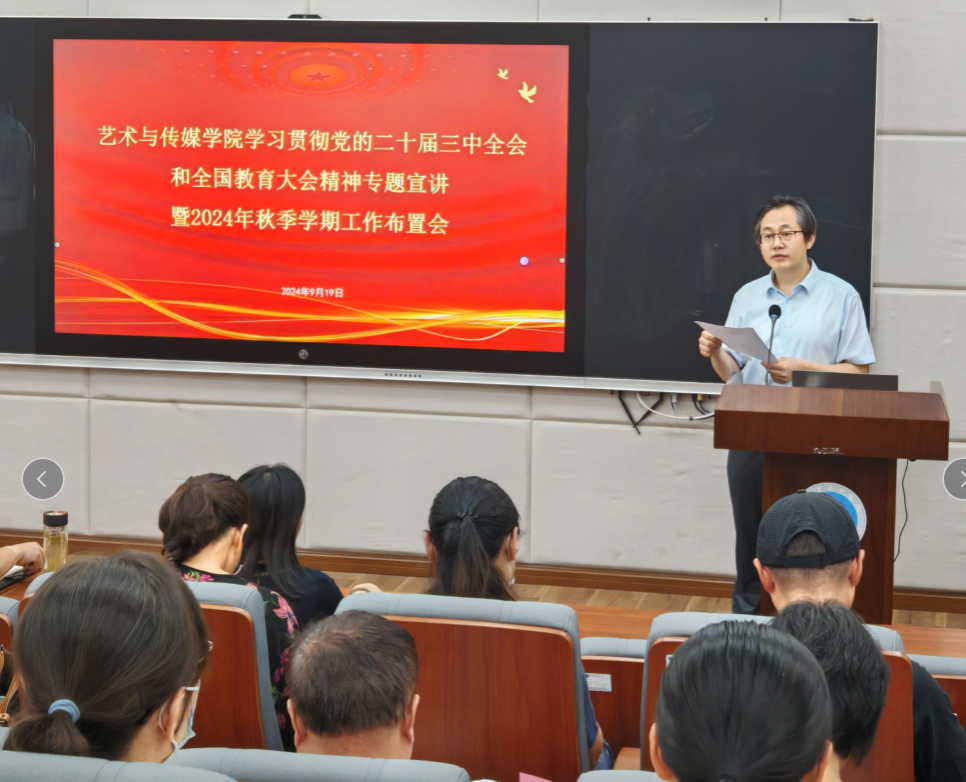 在艺媒楼1104报告厅召开学习贯彻党的二十届三中全会和全国教育大会精神专题宣讲暨2024年秋季学期工作布置会。全体教职工参加会议,党委书记晋曦主持会议。
