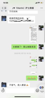 除此之外,代棋帆还通过湖北省晋商商会等组织进行了捐款,也力所能及的远程参与了社会公益人士的援汉活动,曾通过疫情救助相关微信群,帮助在朋友圈、微博中求助治疗的两位陌生新冠肺炎患者联系住院治疗,这其中还有校友的亲戚。虽是绵薄之力,幸多亏了很多舍身在一线救治到民间爱心人士和医护人员,真是英雄和人间天使!