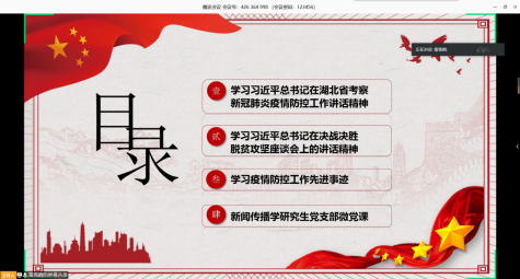 (通讯员:雷雪晴)3月26日下午3时,新闻传播学研究生党支部组织召开了以“坚持不懈坚决打赢疫情防控阻击战”为主题的党日活动,本次党日活动以腾讯会议为平台,采取线上视频会议的方式开展,支部全体党员参加了此次会议。