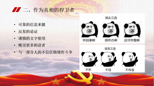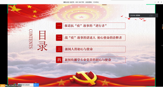 雷雪晴:为了响应学校微党课大赛的号召,我们支部特意准备了以“讲好战疫故事,诠释初心使命——致敬抗疫一线新闻工作者”为主题的微党课。我们的党课主要分为四个部分:一是报道抗“疫”故事的“逆行者”;二是战“疫”故事的讲述人,初心使命的诠释者;三是新闻人的初心与使命——把理想和信念根植于新闻实践;四是新闻传播学专业党员的初心与使命。主讲人分别为:刘沫、我、黄天佑、任红星。下面我们将依次为大家讲解。