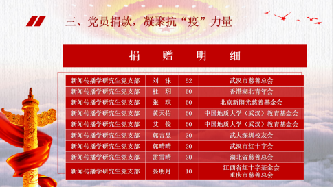 2018级新闻传播学研究生团支部制作了《聚力青春,共克时艰》的微视频,新闻传播学研究生党支部部分党员同志和入党积极分子共同拍摄了《武汉加油,中国加油!》微视频为武汉和中国加油,此外支部党员曹旭、王雪纯、李昀、雷雪晴、黄天佑、李雪、刘沫等用海报、图片、征文等形式诉说着抗疫的故事。