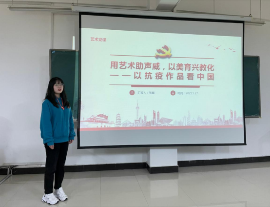 的号召,结合专业特色,将艺术与历史教育相结合,引导支部党员以多种形式讲解艺术党课,使支部党员在红色艺术氛围中学习党史,铭记初心。