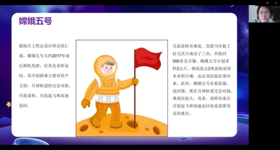 在党课的最后时间还与同学们进行了互动,通过提问的方式回顾了整节艺术党课的内容,例如探月工程分为几期,专业有哪些与探月有相关的东西,同学们积极主动的回答,并且回答认真,最后结束时,我们祝愿国家越来越强大,能早日实现探月计划!